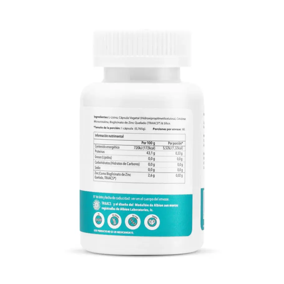 Contiene: L-Lisina, Cápsula Vegetal (Hidroxipropilmetilcelulosa), Celulosa Microcristalina, Bisglicinato de Zinc Quelado (TRAACS®) & Sílice.